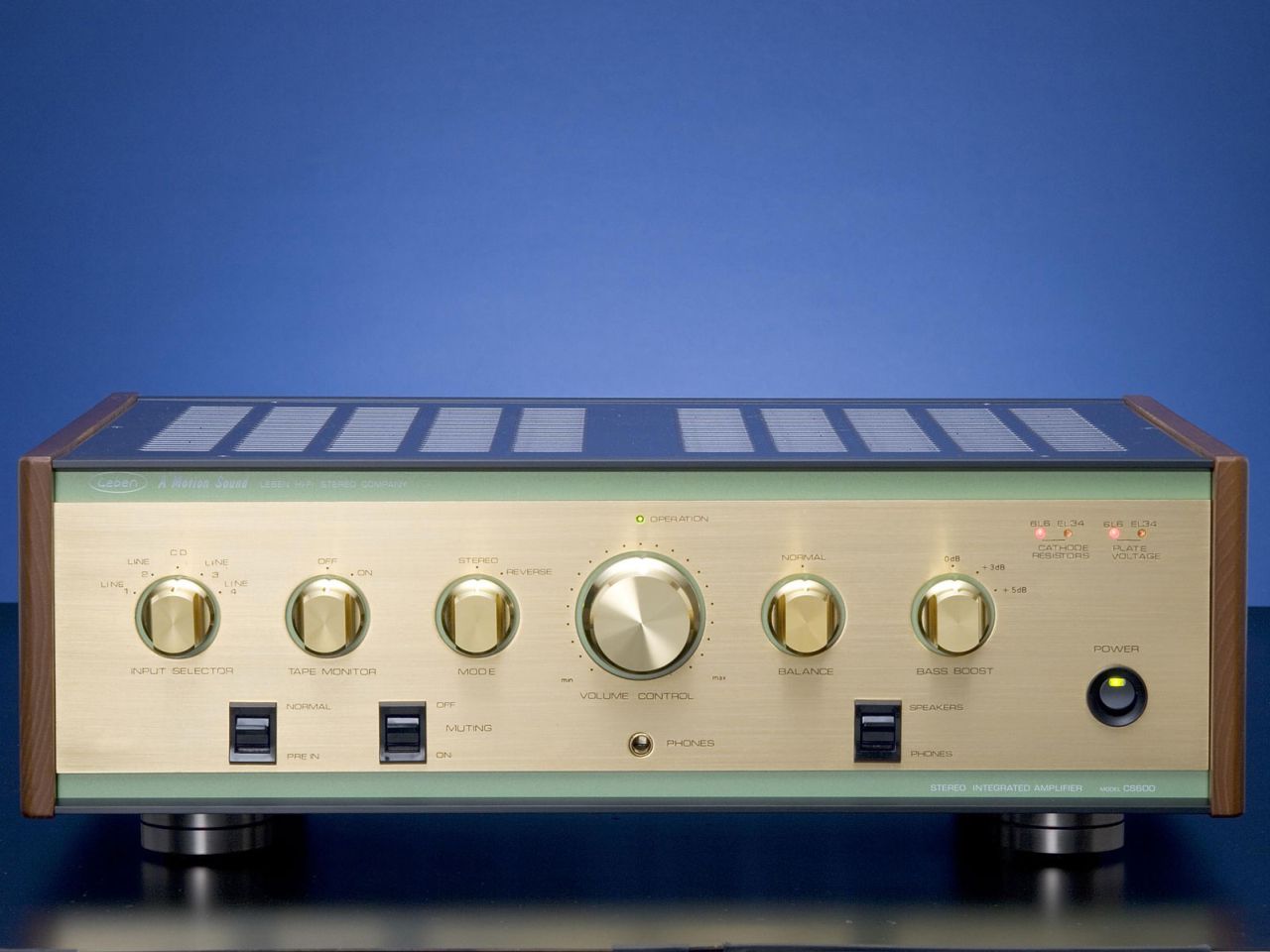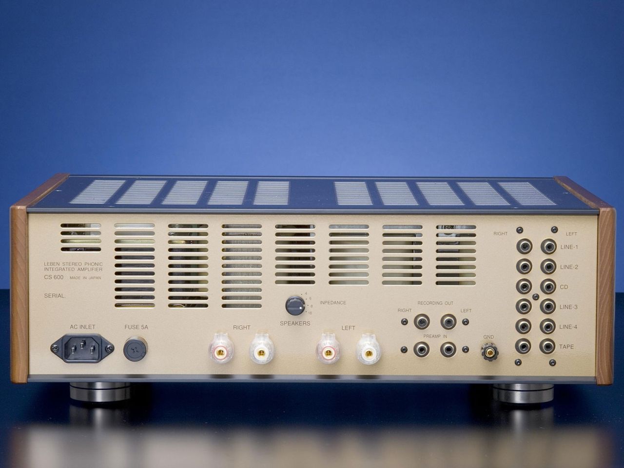 Der LEBEN CS-600 verfügt über 5 Hochpegel-Eingänge und einen zusätzlichen Tape-Eingang/Ausgang. Neben einem Balance-Regler wartet er noch mit einem Bass-Boost auf, der besonders bei bassschwächeren Breitband-Konzepten von großem Vorteil ist und die ohnehin sehr breitbandige Wiedergabe des CS-600 (bis zu 100 kHz) unterstützt. Ein weiteres nützliches Feature – insbesondere für die Nutzung des Kopfhörerausgangs – realisierte Mr. Hyodo mit der Lautsprecher-Stummschaltung mittels Schalter auf der Frontplatte. Der Verstärker kann via Wahlschalter auf 4-, 6-, 8-, und 16- Ohm-Lautsprecher höchst präzise angepasst werden. Durch die 24 Karat-Vergoldung sämtlicher Regler sind keinerlei Fingerabdrücke erkennbar – so steht auch einem ungetrübten optischem Genuss nichts mehr im Wege.